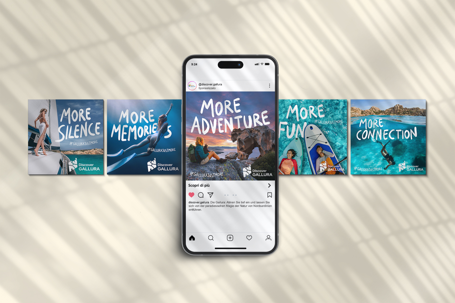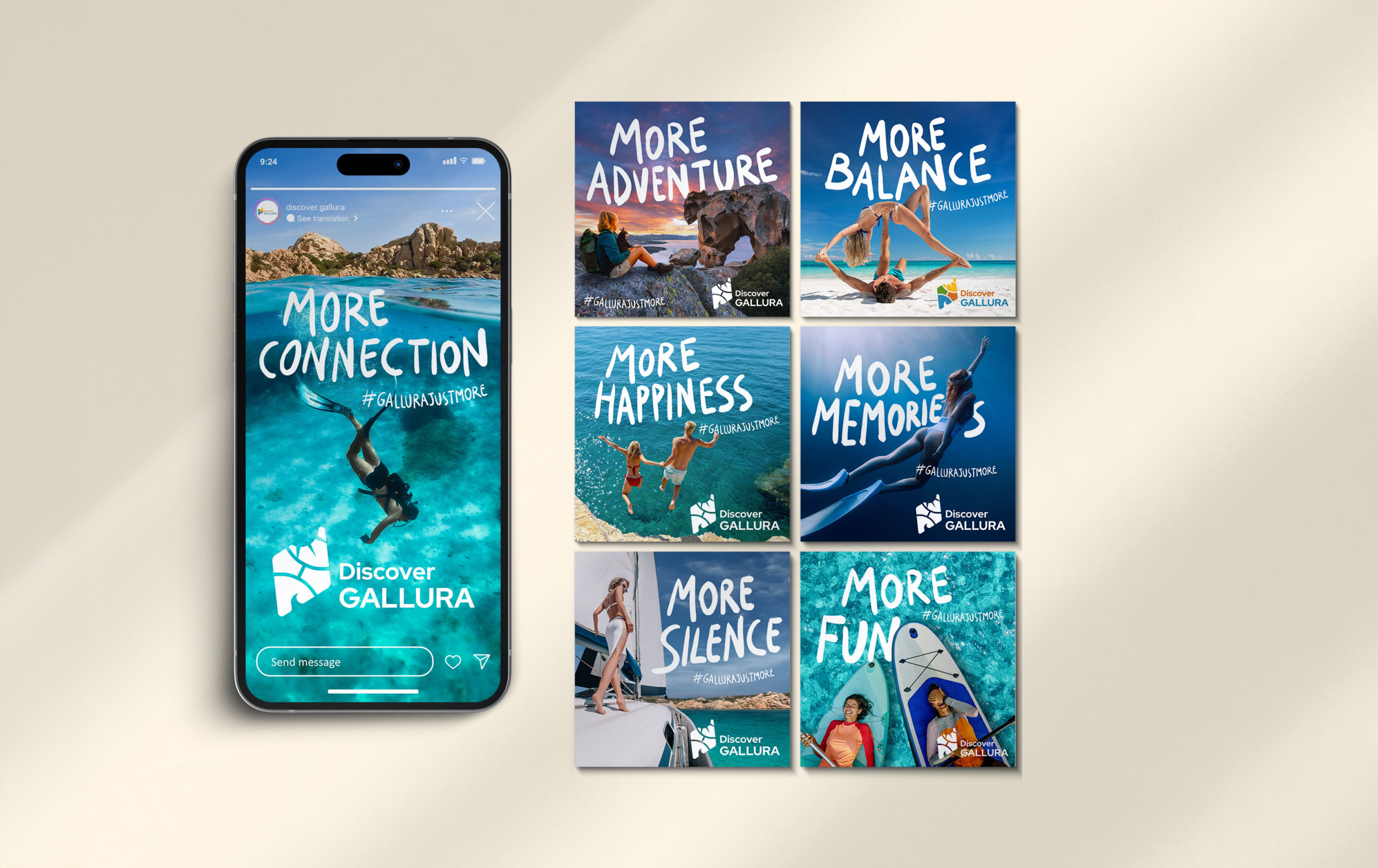 “Le scritte dei claim che avevano come payoff e hashtag Gallura Just More, sono state realizzate a mano per enfatizzare la personalità e l’unicità della destinazione, – aggiunge Lorenzo Saliu, titolare dell’agenzia – seguendo le linee naturali delle immagini per integrarsi armoniosamente nel contesto”.